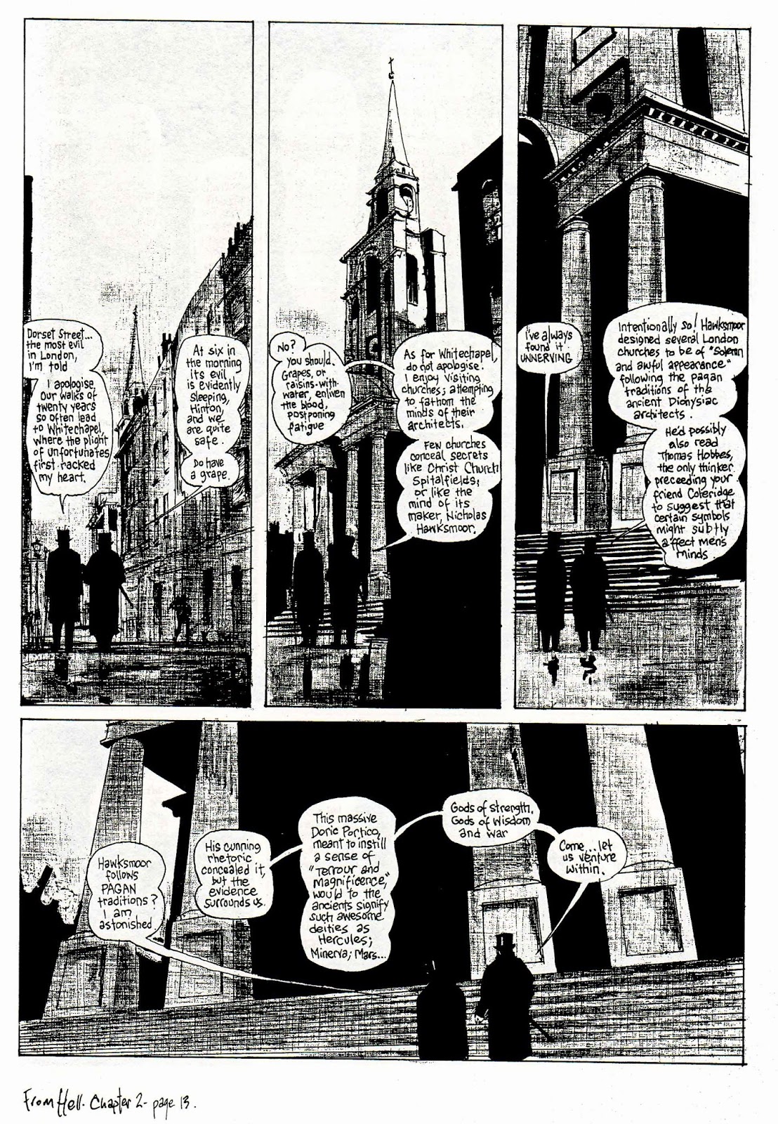 Moore entrelaça a narrativa com elementos do ocultismo e da arquitetura sagrada. Os assassinatos não são aleatórios — são mapeados sobre Londres como um ritual geométrico, cada local escolhido com propósito simbólico.